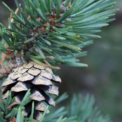 This evergreen tree can grow up to 40 meters (130 feet) and has a flat crown and has a reddish-brown, deeply fissured bark, needle-like gray-green leaves that grow in pairs, orange-yellow flowers and pointed brown cones.