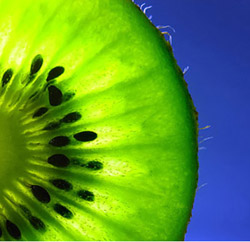 The kiwifruit is a little fruit holding great surprises. The most common species of kiwifruit is Actinidia deliciosa, commonly known as Hayward kiwi. Inside of this small, oval-shaped fruit featuring brown fuzzy skin resides a brilliant, semi-translucent emerald green flesh speckled with a few concentrically arranged white veins and small black seeds. Its flesh is almost creamy in consistency with an invigorating taste reminiscent of a mixture of strawberries and bananas, yet with its own unique sweet flavor.