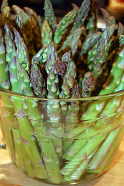 Asparagus, its fleshy spears topped with bud-like compact heads, is often thought of as a luxury vegetable, prized for its succulent taste and tender texture. It is harvested in the spring when it is 6 to 8 inches tall. While the most common variety of asparagus is green in color, two other edible varieties are available. White asparagus, with its more delicate flavor and tender texture, is grown underground to inhibit its development of chlorophyll content, therefore creating its distinctive white coloring. It is generally found canned, although you may find it fresh in some select gourmet shops, and it is generally more expensive than the green variety since its production is more labor intensive. The other edible variety of asparagus is purple in color. It is much smaller than the green or white variety (usually just 2 to 3 inches tall) and features a fruitier flavor. It also provides benefits from phytonutrients called anthocyanins that give it its purple color. With prolonged cooking, the purple color may disappear.