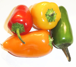 Want to color your life healthy? Brightly colored bell peppers, whether green, red, orange or yellow, are rich sources of some of the best nutrients available. To start, peppers are excellent sources of vitamin C and vitamin A (through its concentration of carotenoids such as beta-carotene), two very powerful antioxidants. These antioxidants work together to effectively neutralize free radicals, which can travel through the body causing huge amounts of damage to cells. Free radicals are major players in the build up of cholesterol in the arteries that leads to atherosclerosis and heart disease, the nerve and blood vessel damage seen in diabetes, the cloudy lenses of cataracts, the joint pain and damage seen in osteoarthritis and rheumatoid arthritis, and the wheezing and airway tightening of asthma. By providing these two potent free radical destroyers, bell peppers may help prevent or reduce some of the symptoms of these conditions by shutting down the source of the problem.