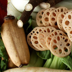 Lotus root is sweet and can be eaten as fruit, sliced and stir fried, or stuffed with glutinous rice in its flue-shaped holes and steamed as dessert. Tender young lotus roots are good for salads while starchy mature lotus roots are good for making soups. Ground mature lotus root powder makes wonderful thick soup and dessert soup. It also stops diarrhea, clears Heat and improve appetite. Lotus roots contain much iron, vitamins B & C. The rich fibre content of lotus roots stimulates peristalsis and relieves constipation. Drinking 2 to 3 glasses of lotus root juice a day can stop bleeding of the esophagus an stomach (vomiting blood); bleeding of the rectum, intestines or stomach (blood in feces); nose bleeding or gum bleeding. Lotus root soup also serves similar purposes. Patients with high fever can drink it cold, while those with steady temperature should drink it warm. Drinking water chestnut juice mixed with pear juice can help clear phlegm while mixing it with grape juice and carrot juice eases dry tongues.
