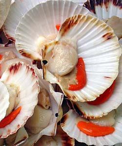 The great scallop gained great prestige during the medieval era. Pilgrims visiting the shrine of St. James in Spain began to use empty scallop shells for both eating and begging. The scallop and its shell quickly became a symbol of this magnificent shrine with people using them to decorate their doorways as well as their coats of arms. In honor of the shrine, they were called the shell of St. James, now best known by their translated French name of Coquille St. Jacques.